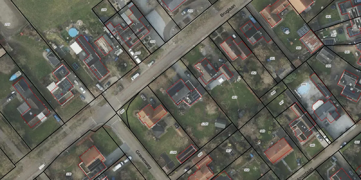 Het perceel waarop Bruglaan 11 staat heeft een oppervlakte van 1071 m². Dit is een zeer groot perceel. De perceeloppervlakte wordt geregistreerd door het Kadaster. Gedetailleerde informatie over de maten van dit perceel kunt u vinden in het rapport Kadastrale kaart met maatvoering van Bruglaan 11.