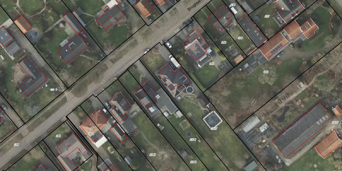 Het perceel waarop Bruglaan 19 staat heeft een oppervlakte van 1650 m². Dit is een zeer groot perceel. De perceeloppervlakte wordt geregistreerd door het Kadaster. Gedetailleerde informatie over de maten van dit perceel kunt u vinden in het rapport Kadastrale kaart met maatvoering van Bruglaan 19.