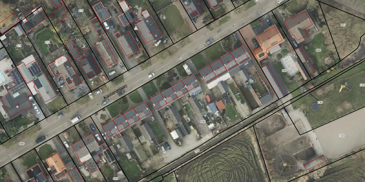 Kastanjelaan 42 is gelegen op kadastraal perceel AML01R690. Deze kadastrale aanduiding is uniek en wordt gebruikt door het Kadaster om eigendomsrechten en andere zakelijke rechten vast te leggen. Het perceel maakt onderdeel uit van de kadastrale gemeente Ambt-Almelo.