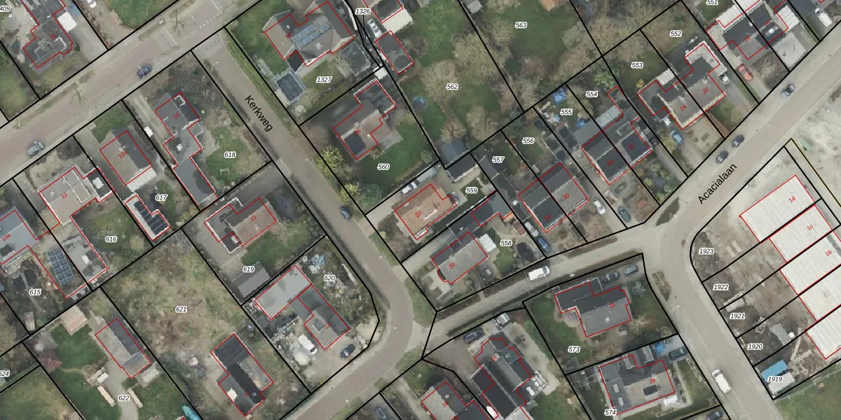 Kerkweg 22 is gelegen op kadastraal perceel AML01R559. Deze kadastrale aanduiding is uniek en wordt gebruikt door het Kadaster om eigendomsrechten en andere zakelijke rechten vast te leggen. Het perceel maakt onderdeel uit van de kadastrale gemeente Ambt-Almelo.