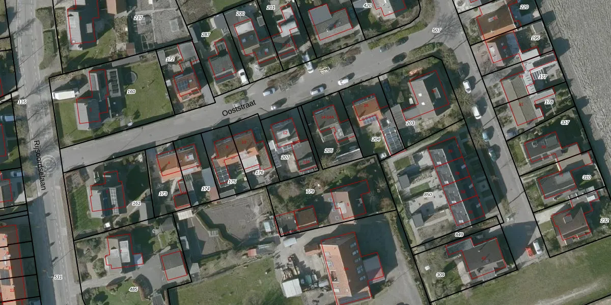Ooststraat 12-A is gelegen op kadastraal perceel MRK02I207. Deze kadastrale aanduiding is uniek en wordt gebruikt door het Kadaster om eigendomsrechten en andere zakelijke rechten vast te leggen. Het perceel maakt onderdeel uit van de kadastrale gemeente Mariekerke.