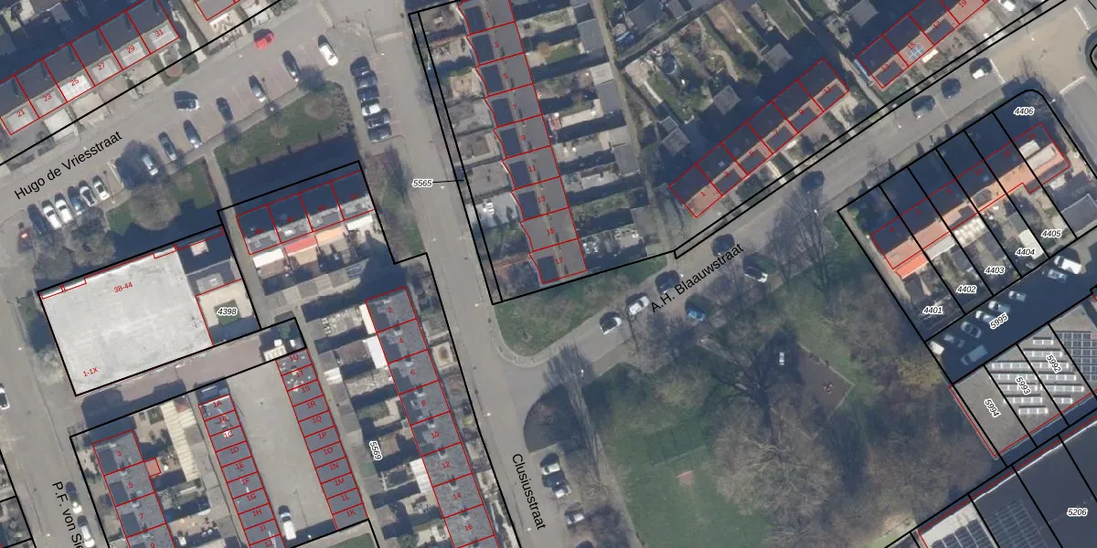 Het perceel waarop Clusiusstraat 17 staat heeft een oppervlakte van 1,1 ha. Dit is een zeer groot perceel. De perceeloppervlakte wordt geregistreerd door het Kadaster. Gedetailleerde informatie over de maten van dit perceel kunt u vinden in het rapport Kadastrale kaart met maatvoering van Clusiusstraat 17.
