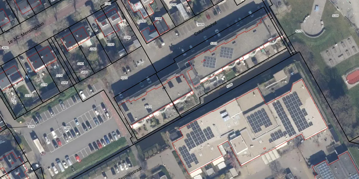 Het perceel waarop Columbiahof 21 staat heeft een oppervlakte van 1850 m². Dit is een zeer groot perceel. De perceeloppervlakte wordt geregistreerd door het Kadaster. Gedetailleerde informatie over de maten van dit perceel kunt u vinden in het rapport Kadastrale kaart met maatvoering van Columbiahof 21.