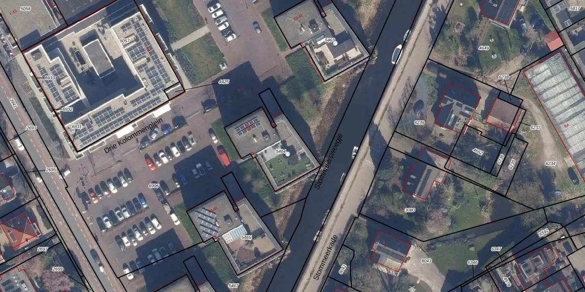 Drie Kolommenplein 45 is gelegen op kadastraal perceel AMR03G5464. Deze kadastrale aanduiding is uniek en wordt gebruikt door het Kadaster om eigendomsrechten en andere zakelijke rechten vast te leggen. Het perceel maakt onderdeel uit van de kadastrale gemeente Aalsmeer.