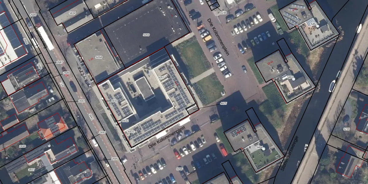 Drie Kolommenplein 6 is gelegen op kadastraal perceel AMR03G5057. Deze kadastrale aanduiding is uniek en wordt gebruikt door het Kadaster om eigendomsrechten en andere zakelijke rechten vast te leggen. Het perceel maakt onderdeel uit van de kadastrale gemeente Aalsmeer.