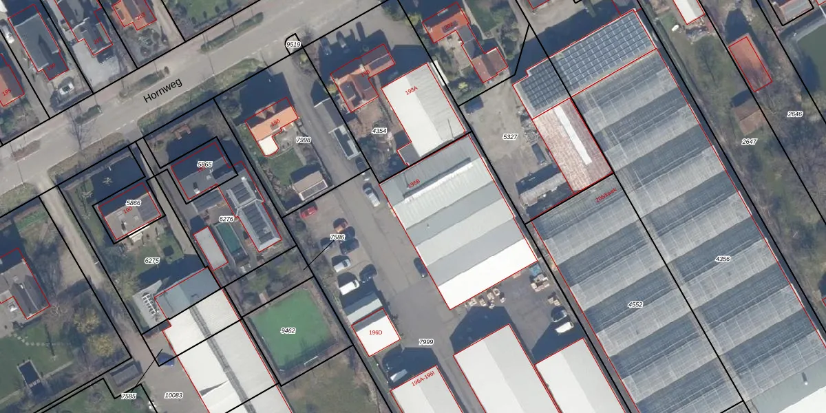 Het perceel waarop Hornweg 196-B staat heeft een oppervlakte van 7110 m². Dit is een zeer groot perceel. De perceeloppervlakte wordt geregistreerd door het Kadaster. Gedetailleerde informatie over de maten van dit perceel kunt u vinden in het rapport Kadastrale kaart met maatvoering van Hornweg 196-B.