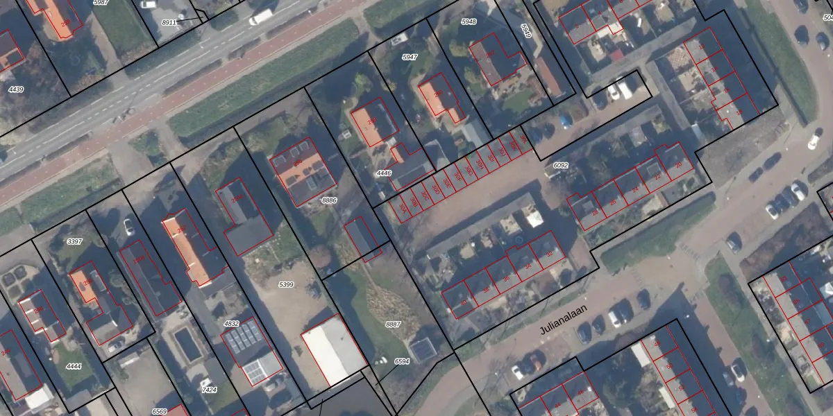 Het perceel waarop Julianalaan 30-B staat heeft een oppervlakte van 3910 m². Dit is een zeer groot perceel. De perceeloppervlakte wordt geregistreerd door het Kadaster. Gedetailleerde informatie over de maten van dit perceel kunt u vinden in het rapport Kadastrale kaart met maatvoering van Julianalaan 30-B.