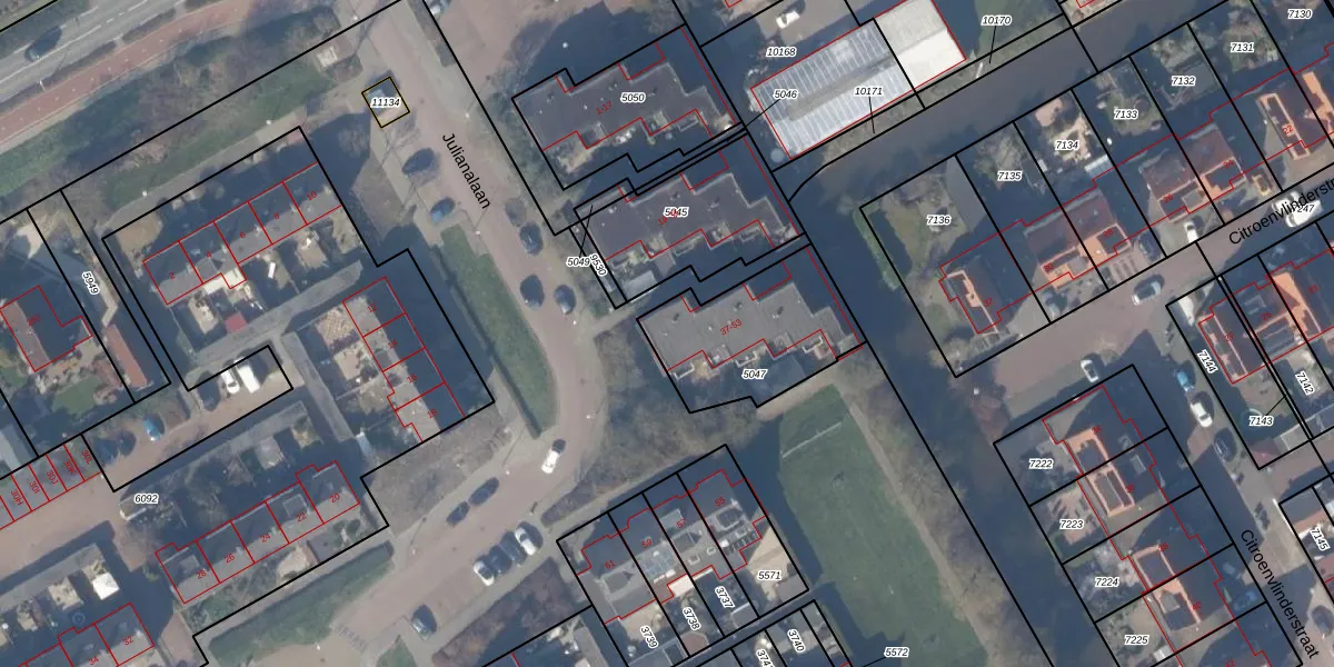 Het perceel waarop Julianalaan 39 staat heeft een oppervlakte van 500 m². Dit is een groot perceel. De perceeloppervlakte wordt geregistreerd door het Kadaster. Gedetailleerde informatie over de maten van dit perceel kunt u vinden in het rapport Kadastrale kaart met maatvoering van Julianalaan 39.