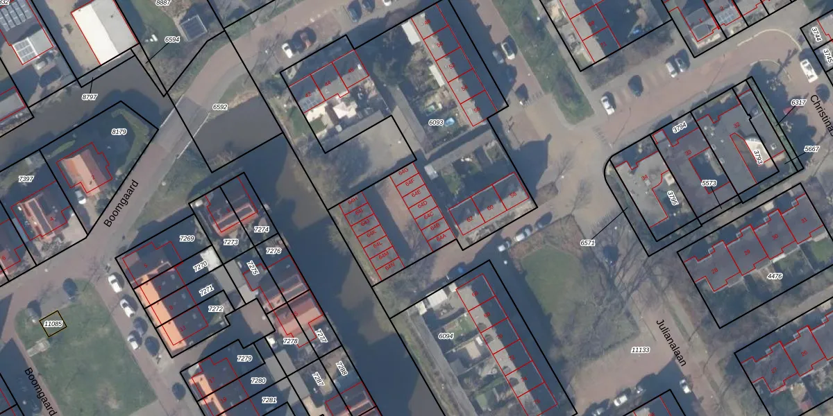 Het perceel waarop Julianalaan 64-D staat heeft een oppervlakte van 2185 m². Dit is een zeer groot perceel. De perceeloppervlakte wordt geregistreerd door het Kadaster. Gedetailleerde informatie over de maten van dit perceel kunt u vinden in het rapport Kadastrale kaart met maatvoering van Julianalaan 64-D.