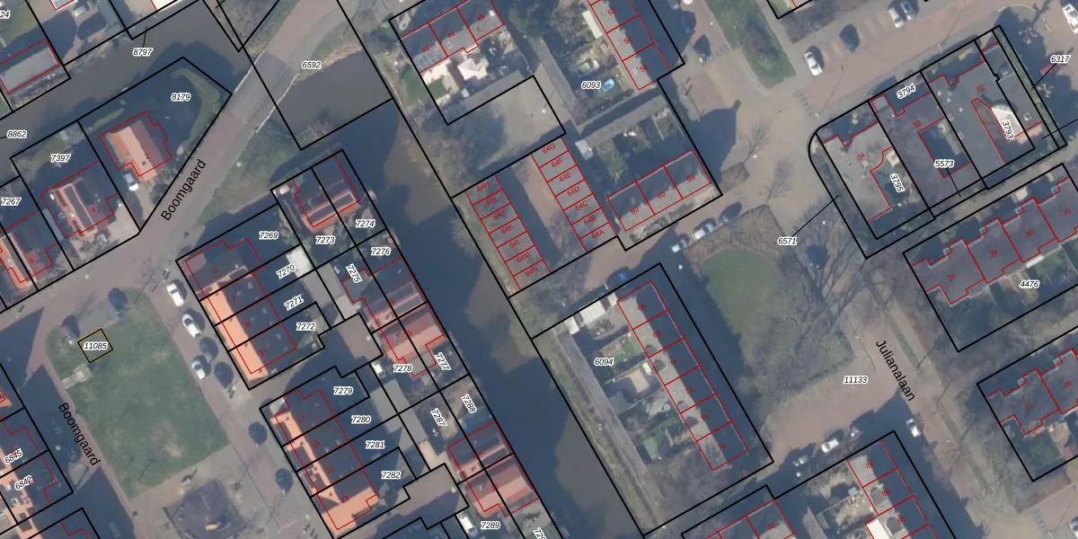 Het perceel waarop Julianalaan 64-N staat heeft een oppervlakte van 2185 m². Dit is een zeer groot perceel. De perceeloppervlakte wordt geregistreerd door het Kadaster. Gedetailleerde informatie over de maten van dit perceel kunt u vinden in het rapport Kadastrale kaart met maatvoering van Julianalaan 64-N.