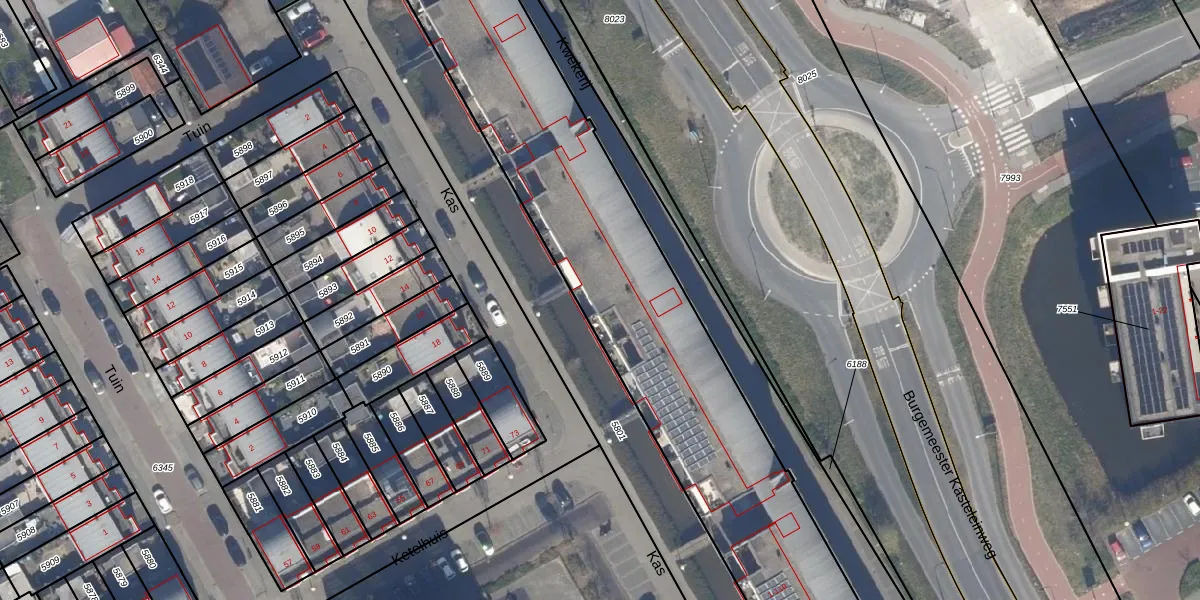 Het perceel waarop Kas 7 staat heeft een oppervlakte van 3301 m². Dit is een zeer groot perceel. De perceeloppervlakte wordt geregistreerd door het Kadaster. Gedetailleerde informatie over de maten van dit perceel kunt u vinden in het rapport Kadastrale kaart met maatvoering van Kas 7.