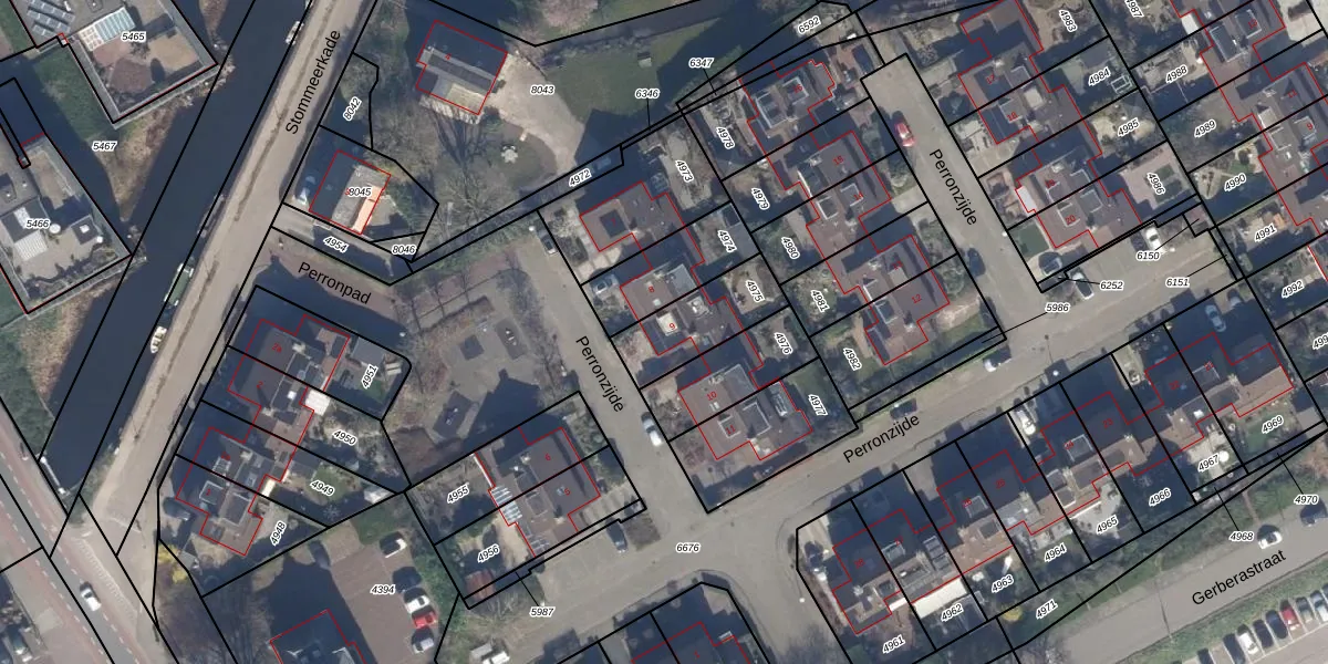 Perronzijde 9 is gelegen op kadastraal perceel AMR03C4975. Deze kadastrale aanduiding is uniek en wordt gebruikt door het Kadaster om eigendomsrechten en andere zakelijke rechten vast te leggen. Het perceel maakt onderdeel uit van de kadastrale gemeente Aalsmeer.