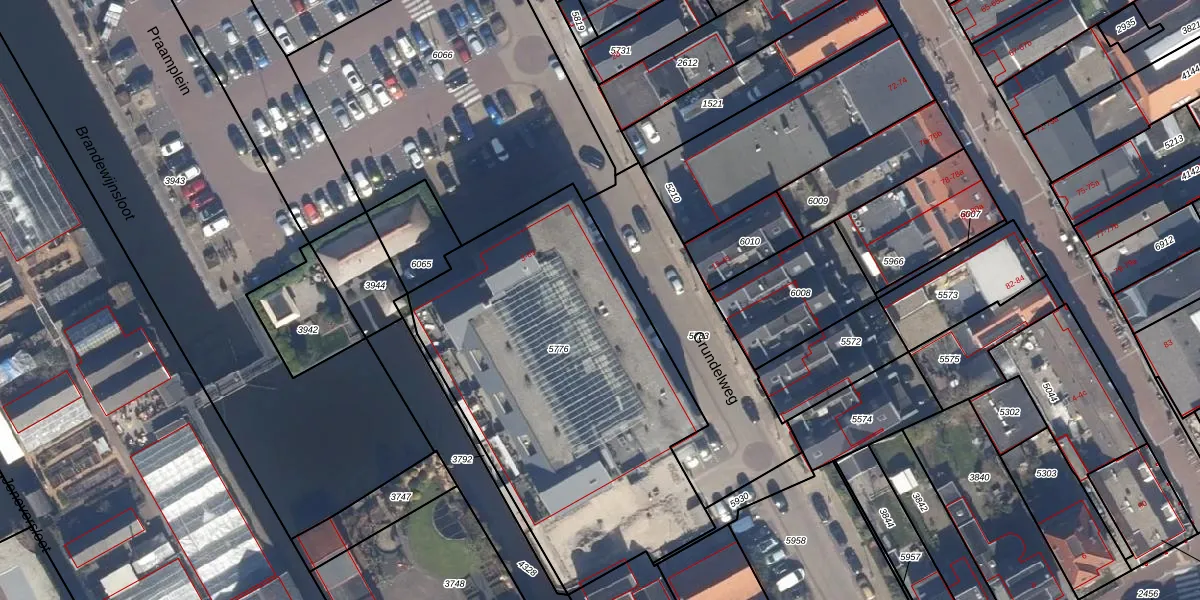 Het perceel waarop Praamplein 53 staat heeft een oppervlakte van 1960 m². Dit is een zeer groot perceel. De perceeloppervlakte wordt geregistreerd door het Kadaster. Gedetailleerde informatie over de maten van dit perceel kunt u vinden in het rapport Kadastrale kaart met maatvoering van Praamplein 53.