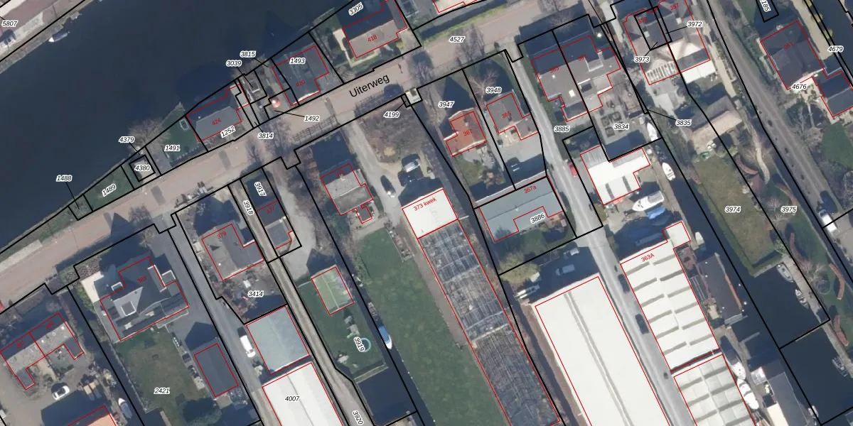 Het perceel waarop Uiterweg 373-kwek staat heeft een oppervlakte van 6868 m². Dit is een zeer groot perceel. De perceeloppervlakte wordt geregistreerd door het Kadaster. Gedetailleerde informatie over de maten van dit perceel kunt u vinden in het rapport Kadastrale kaart met maatvoering van Uiterweg 373-kwek.