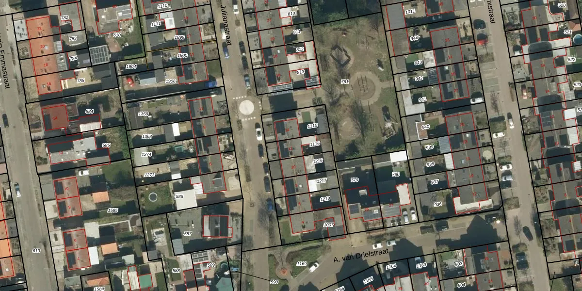 Het perceel waarop Julianastraat 12 staat heeft een oppervlakte van 144 m². Dit is een middelgroot perceel. De perceeloppervlakte wordt geregistreerd door het Kadaster. Gedetailleerde informatie over de maten van dit perceel kunt u vinden in het rapport Kadastrale kaart met maatvoering van Julianastraat 12.