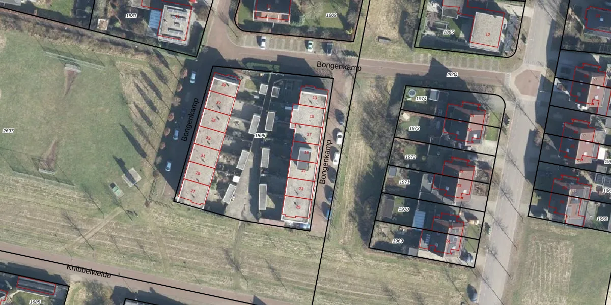 Het perceel waarop Bongenkamp 19 staat heeft een oppervlakte van 2088 m². Dit is een zeer groot perceel. De perceeloppervlakte wordt geregistreerd door het Kadaster. Gedetailleerde informatie over de maten van dit perceel kunt u vinden in het rapport Kadastrale kaart met maatvoering van Bongenkamp 19.