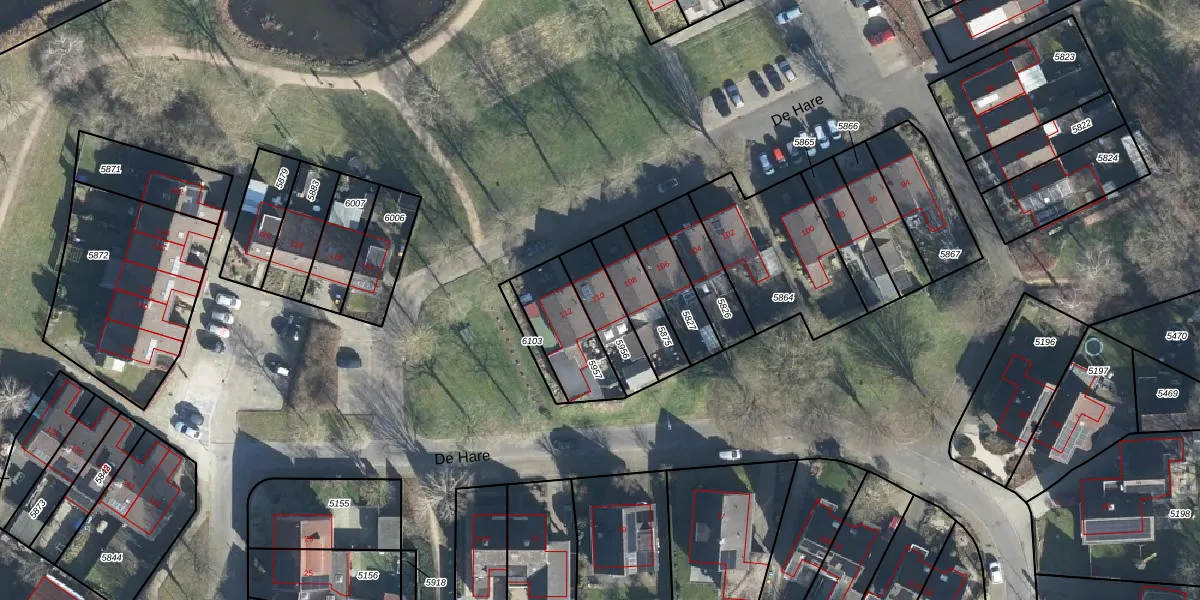 Het perceel waarop De Hare 110 staat heeft een oppervlakte van 155 m². Dit is een middelgroot perceel. De perceeloppervlakte wordt geregistreerd door het Kadaster. Gedetailleerde informatie over de maten van dit perceel kunt u vinden in het rapport Kadastrale kaart met maatvoering van De Hare 110.