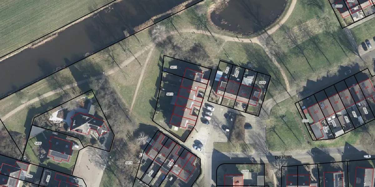 Het perceel waarop De Hare 126 staat heeft een oppervlakte van 695 m². Dit is een groot perceel. De perceeloppervlakte wordt geregistreerd door het Kadaster. Gedetailleerde informatie over de maten van dit perceel kunt u vinden in het rapport Kadastrale kaart met maatvoering van De Hare 126.
