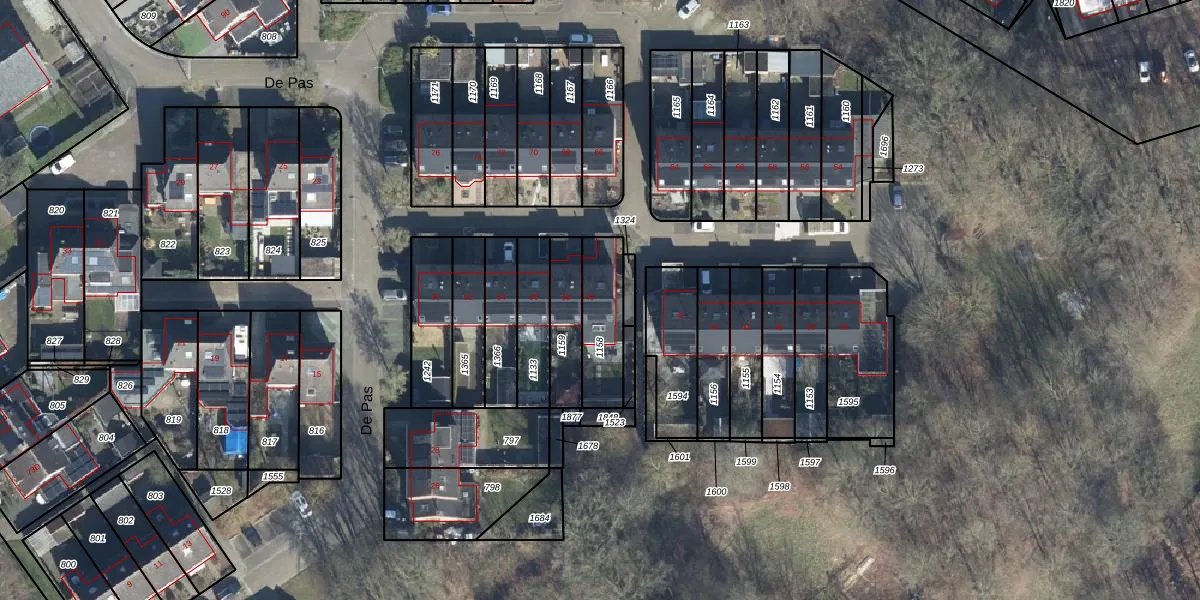Het perceel waarop De Pas 40 staat heeft een oppervlakte van 196 m². Dit is een middelgroot perceel. De perceeloppervlakte wordt geregistreerd door het Kadaster. Gedetailleerde informatie over de maten van dit perceel kunt u vinden in het rapport Kadastrale kaart met maatvoering van De Pas 40.