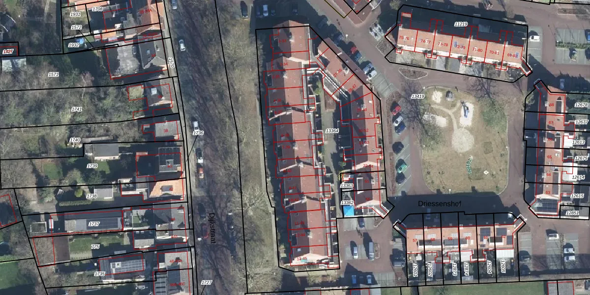 Het perceel waarop Driessenshof 20 staat heeft een oppervlakte van 2440 m². Dit is een zeer groot perceel. De perceeloppervlakte wordt geregistreerd door het Kadaster. Gedetailleerde informatie over de maten van dit perceel kunt u vinden in het rapport Kadastrale kaart met maatvoering van Driessenshof 20.