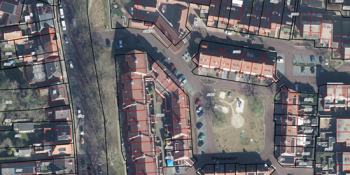 Het perceel waarop Driessenshof 28 staat heeft een oppervlakte van 2440 m². Dit is een zeer groot perceel. De perceeloppervlakte wordt geregistreerd door het Kadaster. Gedetailleerde informatie over de maten van dit perceel kunt u vinden in het rapport Kadastrale kaart met maatvoering van Driessenshof 28.