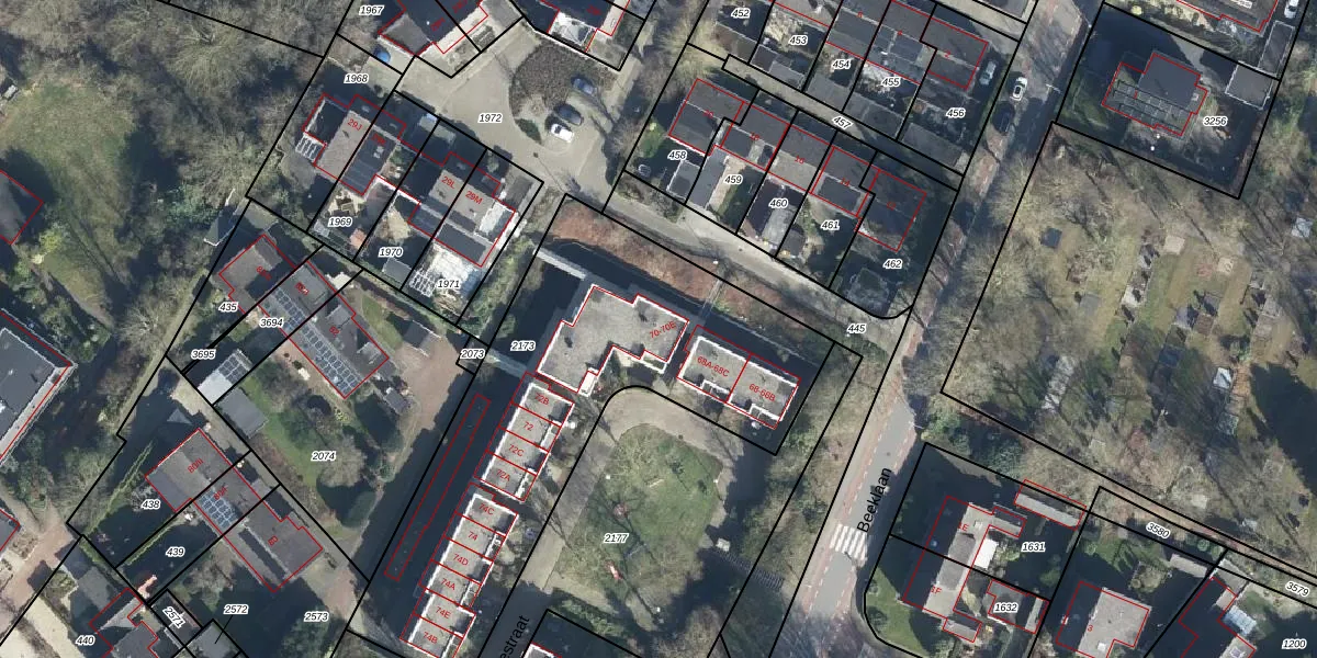Het perceel waarop Hogestraat 70-B staat heeft een oppervlakte van 1995 m². Dit is een zeer groot perceel. De perceeloppervlakte wordt geregistreerd door het Kadaster. Gedetailleerde informatie over de maten van dit perceel kunt u vinden in het rapport Kadastrale kaart met maatvoering van Hogestraat 70-B.