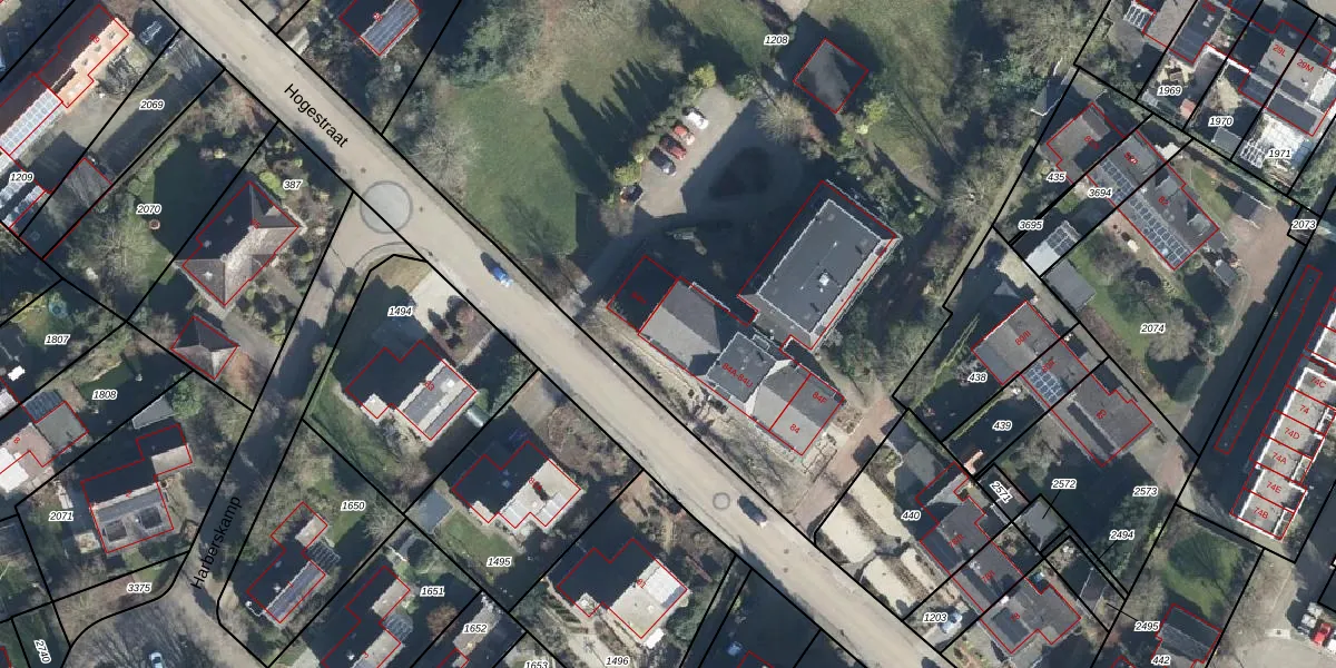 Het perceel waarop Hogestraat 84-D staat heeft een oppervlakte van 7625 m². Dit is een zeer groot perceel. De perceeloppervlakte wordt geregistreerd door het Kadaster. Gedetailleerde informatie over de maten van dit perceel kunt u vinden in het rapport Kadastrale kaart met maatvoering van Hogestraat 84-D.