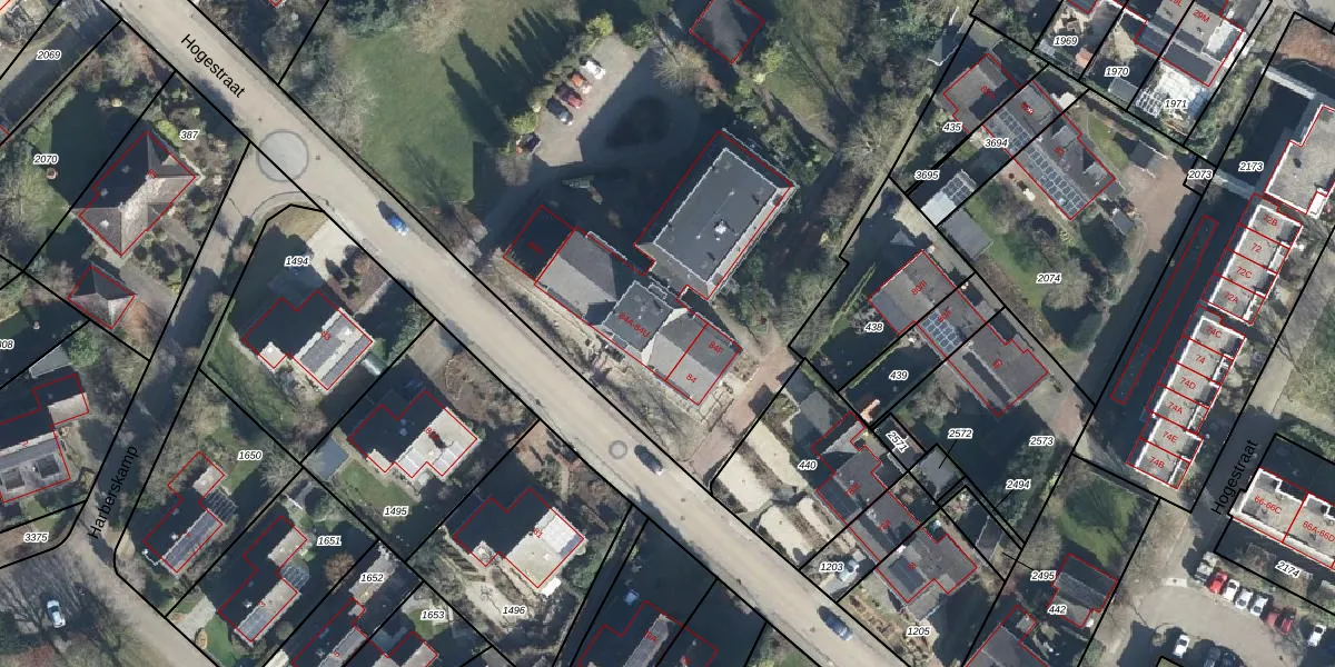 Het perceel waarop Hogestraat 84-J staat heeft een oppervlakte van 7625 m². Dit is een zeer groot perceel. De perceeloppervlakte wordt geregistreerd door het Kadaster. Gedetailleerde informatie over de maten van dit perceel kunt u vinden in het rapport Kadastrale kaart met maatvoering van Hogestraat 84-J.