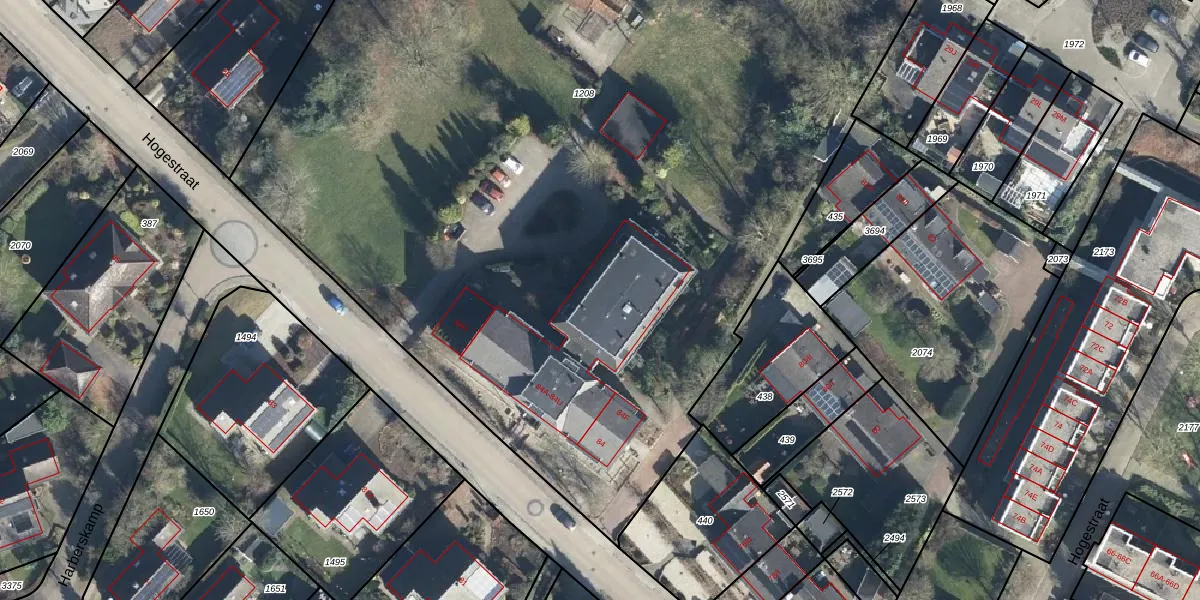 Het perceel waarop Hogestraat 84-T staat heeft een oppervlakte van 7625 m². Dit is een zeer groot perceel. De perceeloppervlakte wordt geregistreerd door het Kadaster. Gedetailleerde informatie over de maten van dit perceel kunt u vinden in het rapport Kadastrale kaart met maatvoering van Hogestraat 84-T.
