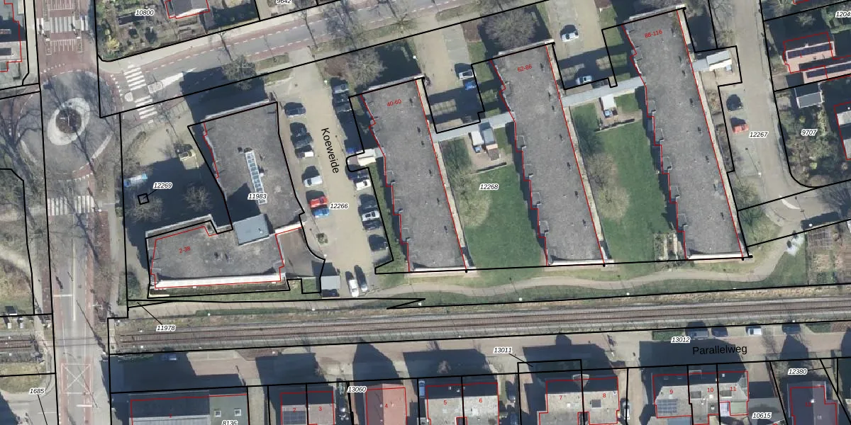 Het perceel waarop Koeweide 46 staat heeft een oppervlakte van 4064 m². Dit is een zeer groot perceel. De perceeloppervlakte wordt geregistreerd door het Kadaster. Gedetailleerde informatie over de maten van dit perceel kunt u vinden in het rapport Kadastrale kaart met maatvoering van Koeweide 46.