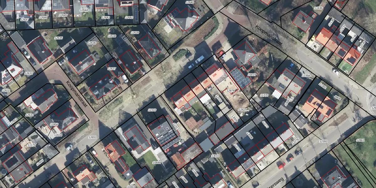 Het perceel waarop Koopmanstraat 102 staat heeft een oppervlakte van 1100 m². Dit is een zeer groot perceel. De perceeloppervlakte wordt geregistreerd door het Kadaster. Gedetailleerde informatie over de maten van dit perceel kunt u vinden in het rapport Kadastrale kaart met maatvoering van Koopmanstraat 102.