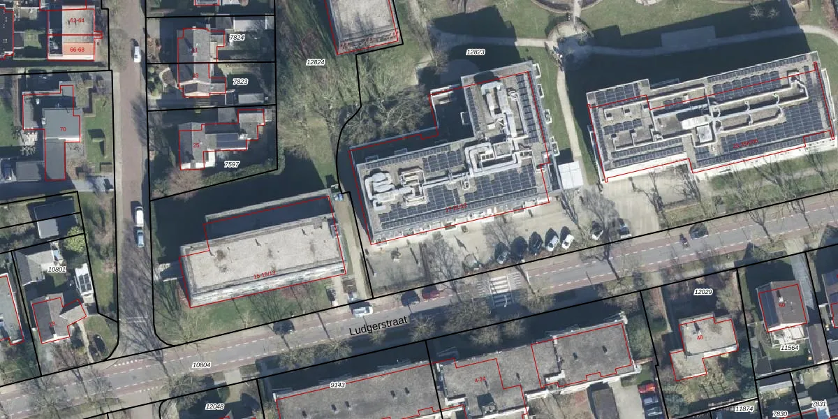 Het perceel waarop Ludgerstraat 19-04 staat heeft een oppervlakte van 9215 m². Dit is een zeer groot perceel. De perceeloppervlakte wordt geregistreerd door het Kadaster. Gedetailleerde informatie over de maten van dit perceel kunt u vinden in het rapport Kadastrale kaart met maatvoering van Ludgerstraat 19-04.