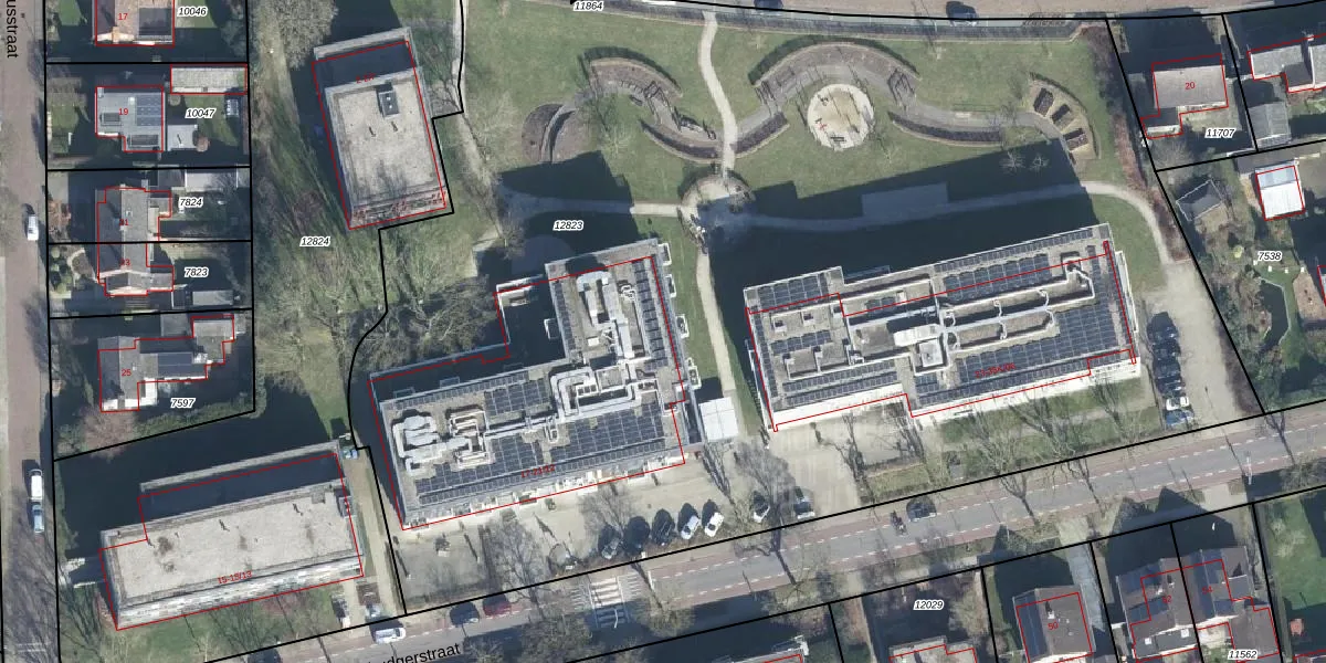 Het perceel waarop Ludgerstraat 21-12 staat heeft een oppervlakte van 9215 m². Dit is een zeer groot perceel. De perceeloppervlakte wordt geregistreerd door het Kadaster. Gedetailleerde informatie over de maten van dit perceel kunt u vinden in het rapport Kadastrale kaart met maatvoering van Ludgerstraat 21-12.