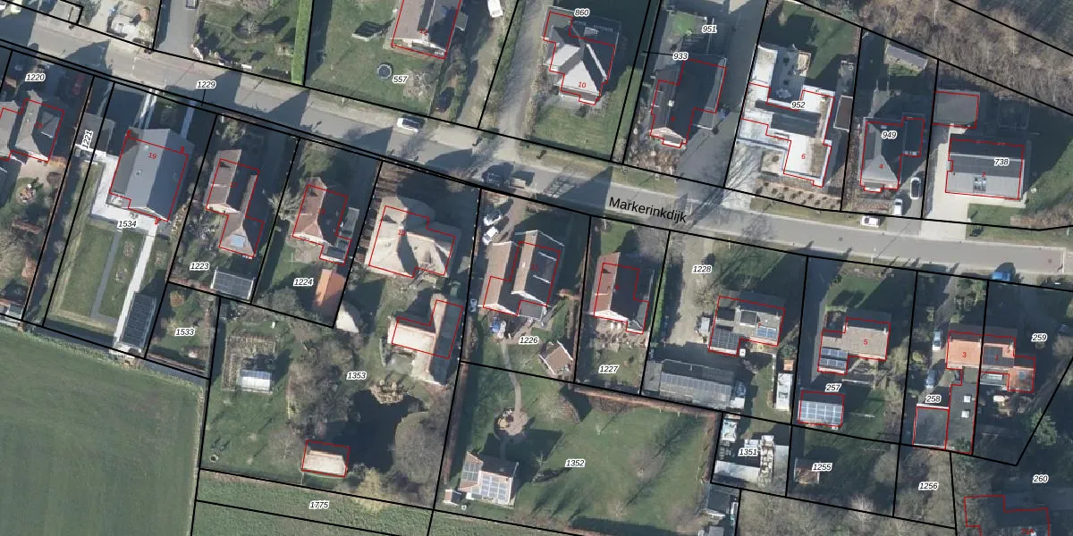 Het perceel waarop Markerinkdijk 11 staat heeft een oppervlakte van 687 m². Dit is een groot perceel. De perceeloppervlakte wordt geregistreerd door het Kadaster. Gedetailleerde informatie over de maten van dit perceel kunt u vinden in het rapport Kadastrale kaart met maatvoering van Markerinkdijk 11.