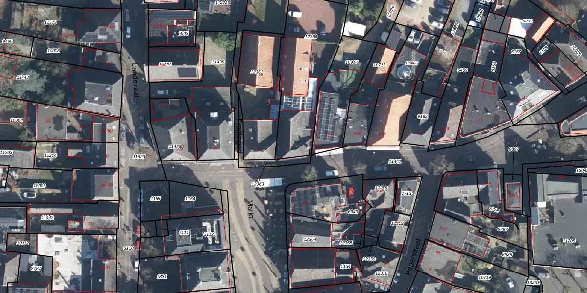 Het perceel waarop Markt 12 staat heeft een oppervlakte van 778 m². Dit is een groot perceel. De perceeloppervlakte wordt geregistreerd door het Kadaster. Gedetailleerde informatie over de maten van dit perceel kunt u vinden in het rapport Kadastrale kaart met maatvoering van Markt 12.