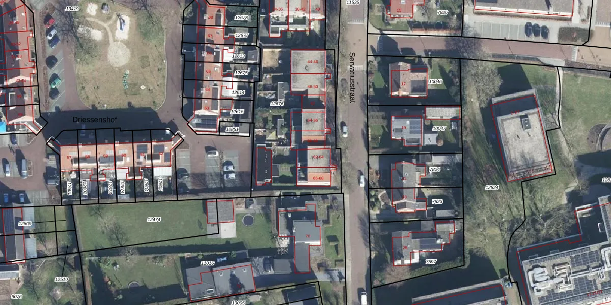Het perceel waarop Servatiusstraat 62 staat heeft een oppervlakte van 1712 m². Dit is een zeer groot perceel. De perceeloppervlakte wordt geregistreerd door het Kadaster. Gedetailleerde informatie over de maten van dit perceel kunt u vinden in het rapport Kadastrale kaart met maatvoering van Servatiusstraat 62.
