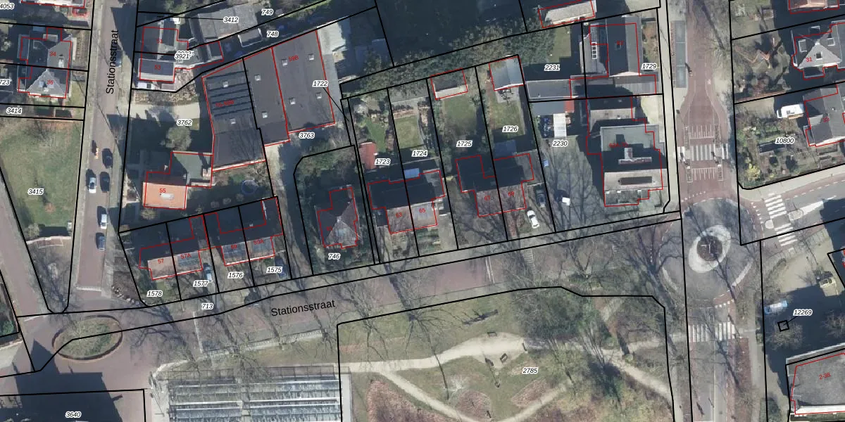 Het perceel waarop Stationsstraat 65 staat heeft een oppervlakte van 387 m². Dit is een groot perceel. De perceeloppervlakte wordt geregistreerd door het Kadaster. Gedetailleerde informatie over de maten van dit perceel kunt u vinden in het rapport Kadastrale kaart met maatvoering van Stationsstraat 65.