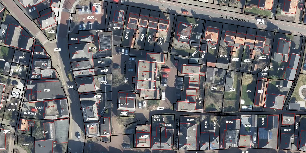 Het perceel waarop Veemarkt 18 staat heeft een oppervlakte van 593 m². Dit is een groot perceel. De perceeloppervlakte wordt geregistreerd door het Kadaster. Gedetailleerde informatie over de maten van dit perceel kunt u vinden in het rapport Kadastrale kaart met maatvoering van Veemarkt 18.