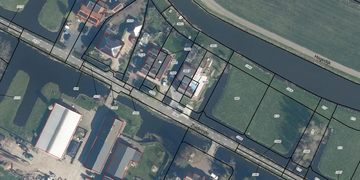 Zuideinde 63 is gelegen op kadastraal perceel ALD00A2449. Deze kadastrale aanduiding is uniek en wordt gebruikt door het Kadaster om eigendomsrechten en andere zakelijke rechten vast te leggen. Het perceel maakt onderdeel uit van de kadastrale gemeente Aarlanderveen.