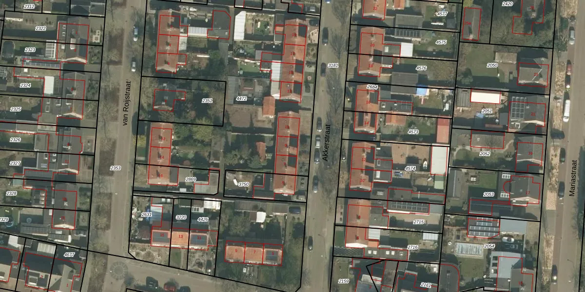 Het perceel waarop Akkerstraat 9 staat heeft een oppervlakte van 4114 m². Dit is een zeer groot perceel. De perceeloppervlakte wordt geregistreerd door het Kadaster. Gedetailleerde informatie over de maten van dit perceel kunt u vinden in het rapport Kadastrale kaart met maatvoering van Akkerstraat 9.