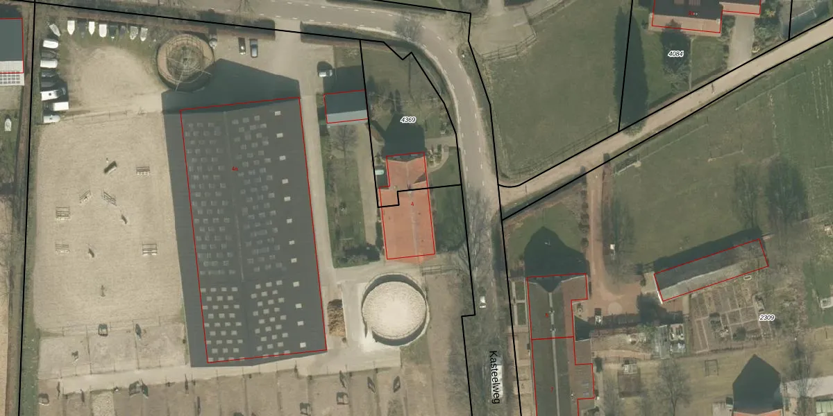 Het perceel waarop Kasteelweg 4 staat heeft een oppervlakte van 2,5 ha. Dit is een zeer groot perceel. De perceeloppervlakte wordt geregistreerd door het Kadaster. Gedetailleerde informatie over de maten van dit perceel kunt u vinden in het rapport Kadastrale kaart met maatvoering van Kasteelweg 4.