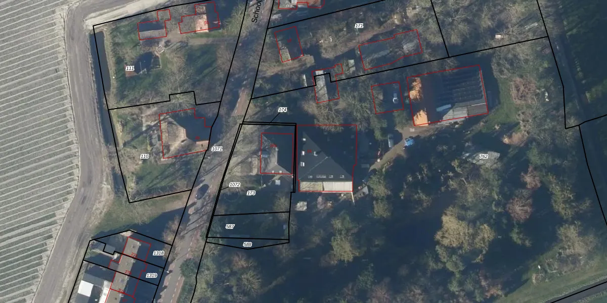 Het perceel waarop Schoolstraat 16 staat heeft een oppervlakte van 1,1 ha. Dit is een zeer groot perceel. De perceeloppervlakte wordt geregistreerd door het Kadaster. Gedetailleerde informatie over de maten van dit perceel kunt u vinden in het rapport Kadastrale kaart met maatvoering van Schoolstraat 16.
