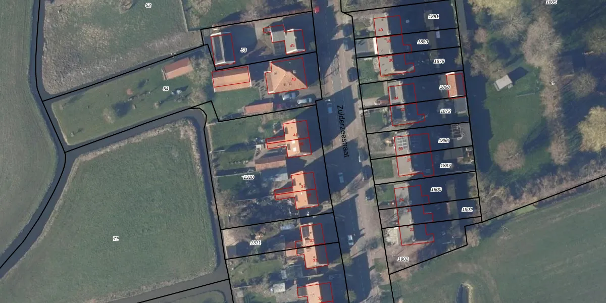 Het perceel waarop Zuiderzeestraat 39 staat heeft een oppervlakte van 1371 m². Dit is een zeer groot perceel. De perceeloppervlakte wordt geregistreerd door het Kadaster. Gedetailleerde informatie over de maten van dit perceel kunt u vinden in het rapport Kadastrale kaart met maatvoering van Zuiderzeestraat 39.