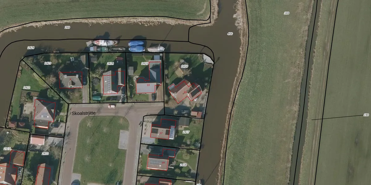 Het perceel waarop Skoalstrjitte 15 staat heeft een oppervlakte van 845 m². Dit is een groot perceel. De perceeloppervlakte wordt geregistreerd door het Kadaster. Gedetailleerde informatie over de maten van dit perceel kunt u vinden in het rapport Kadastrale kaart met maatvoering van Skoalstrjitte 15.