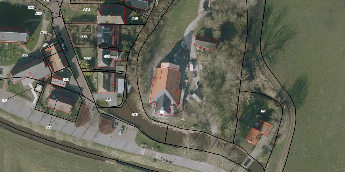 Het perceel waarop Twiska 1 staat heeft een oppervlakte van 1,6 ha. Dit is een zeer groot perceel. De perceeloppervlakte wordt geregistreerd door het Kadaster. Gedetailleerde informatie over de maten van dit perceel kunt u vinden in het rapport Kadastrale kaart met maatvoering van Twiska 1.
