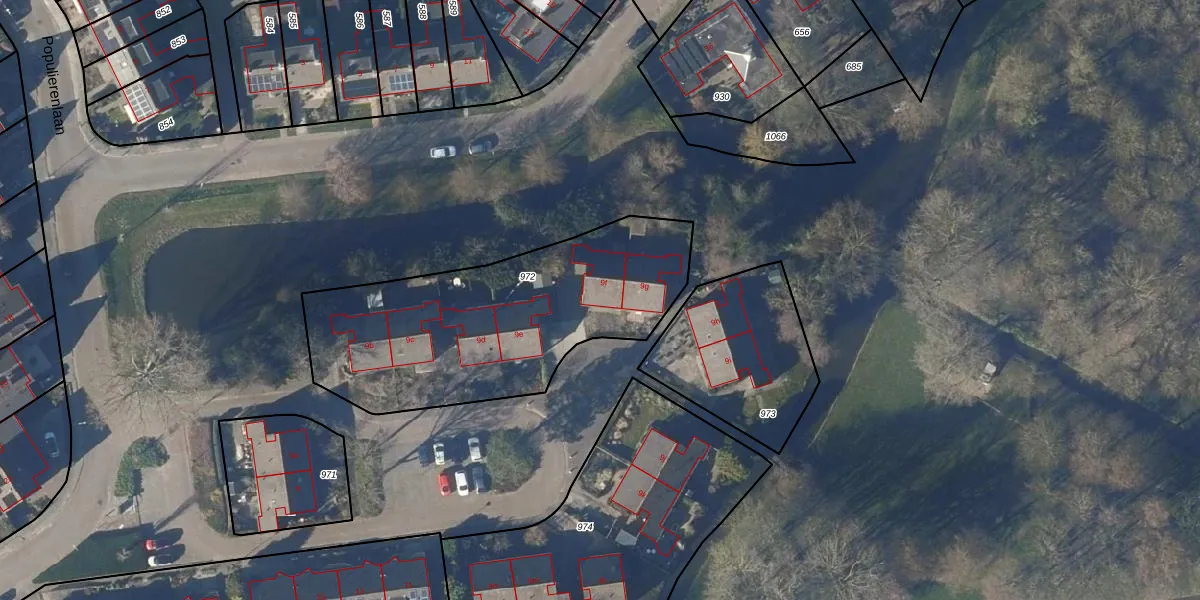 Populierenlaan 9-f is gelegen op kadastraal perceel KGL01B972. Deze kadastrale aanduiding is uniek en wordt gebruikt door het Kadaster om eigendomsrechten en andere zakelijke rechten vast te leggen. Het perceel maakt onderdeel uit van de kadastrale gemeente Noorder-Koggenland.