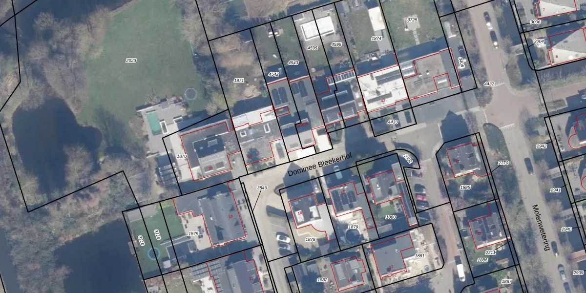 Het perceel waarop Dominee Bleekerhof 39 staat heeft een oppervlakte van 340 m². Dit is een groot perceel. De perceeloppervlakte wordt geregistreerd door het Kadaster. Gedetailleerde informatie over de maten van dit perceel kunt u vinden in het rapport Kadastrale kaart met maatvoering van Dominee Bleekerhof 39.