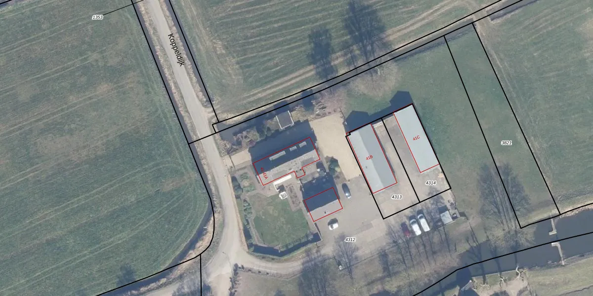 Het perceel waarop Koppeldijk 41-A staat heeft een oppervlakte van 7617 m². Dit is een zeer groot perceel. De perceeloppervlakte wordt geregistreerd door het Kadaster. Gedetailleerde informatie over de maten van dit perceel kunt u vinden in het rapport Kadastrale kaart met maatvoering van Koppeldijk 41-A.