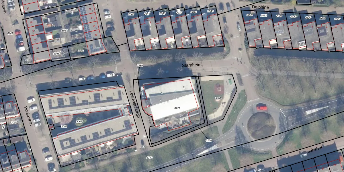 Het perceel waarop Leeuwenburgh 44 staat heeft een oppervlakte van 1077 m². Dit is een zeer groot perceel. De perceeloppervlakte wordt geregistreerd door het Kadaster. Gedetailleerde informatie over de maten van dit perceel kunt u vinden in het rapport Kadastrale kaart met maatvoering van Leeuwenburgh 44.