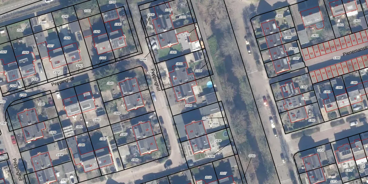 Het perceel waarop Peppinghof 41 staat heeft een oppervlakte van 390 m². Dit is een groot perceel. De perceeloppervlakte wordt geregistreerd door het Kadaster. Gedetailleerde informatie over de maten van dit perceel kunt u vinden in het rapport Kadastrale kaart met maatvoering van Peppinghof 41.